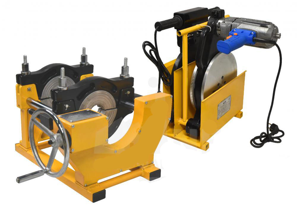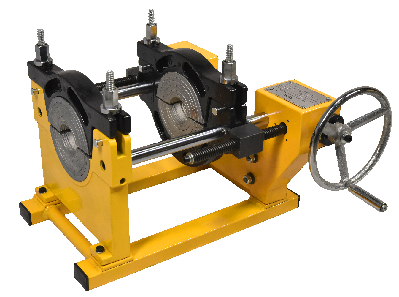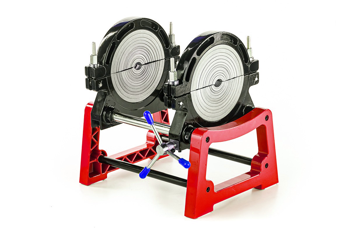 Машина комплектуется центратором с двумя алюминиевыми зажимами, которые фиксируют трубы и удерживают их по оси. Механический редуктор обеспечивает плавную и стабильную подачу усилия в зону сварки, повышая качество стыка. Нагревательный элемент с тефлоновым покрытием разогревает торцы труб до заданной температуры, после чего выполняется осадка под действием усилия от редуктора.