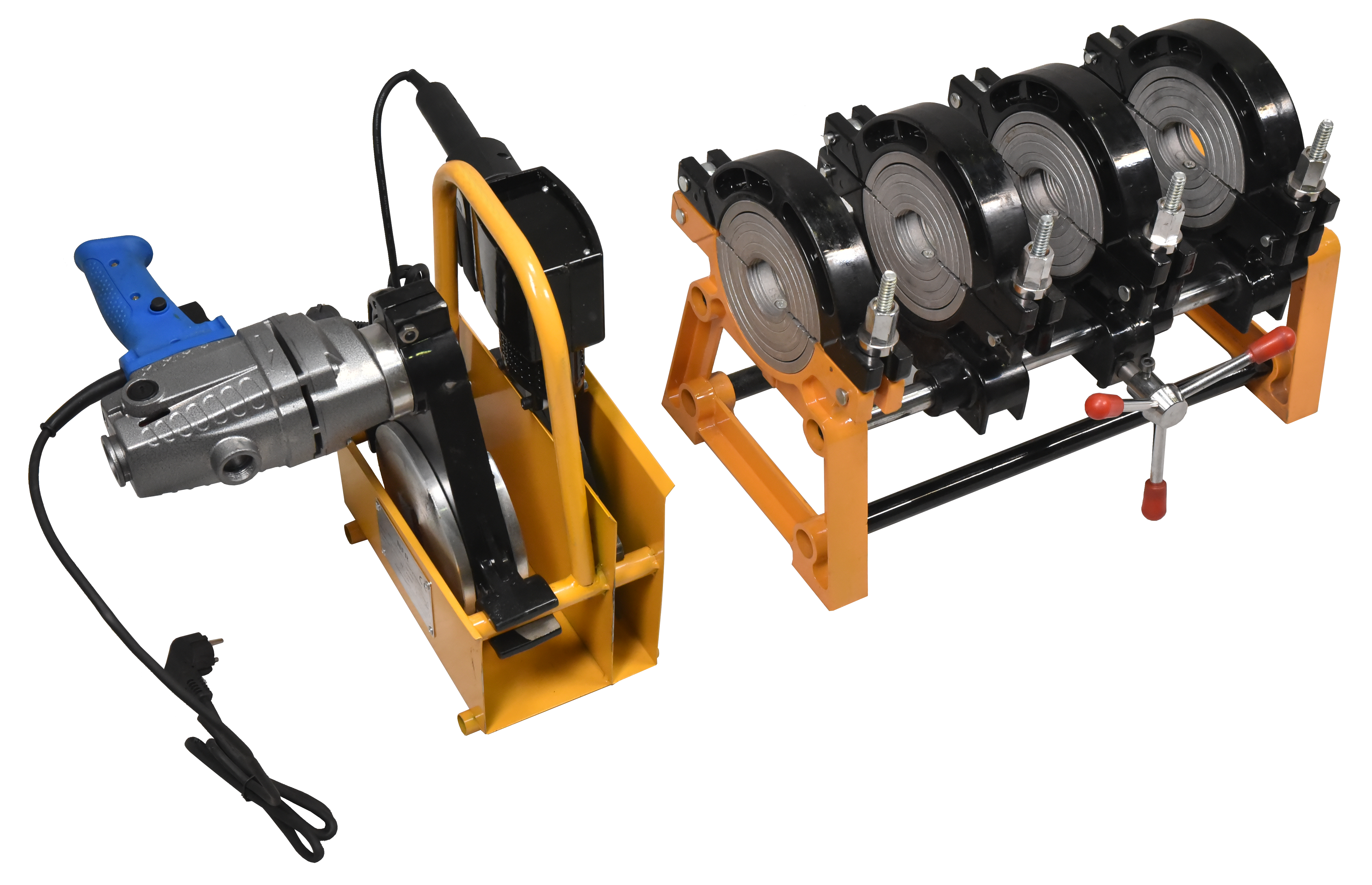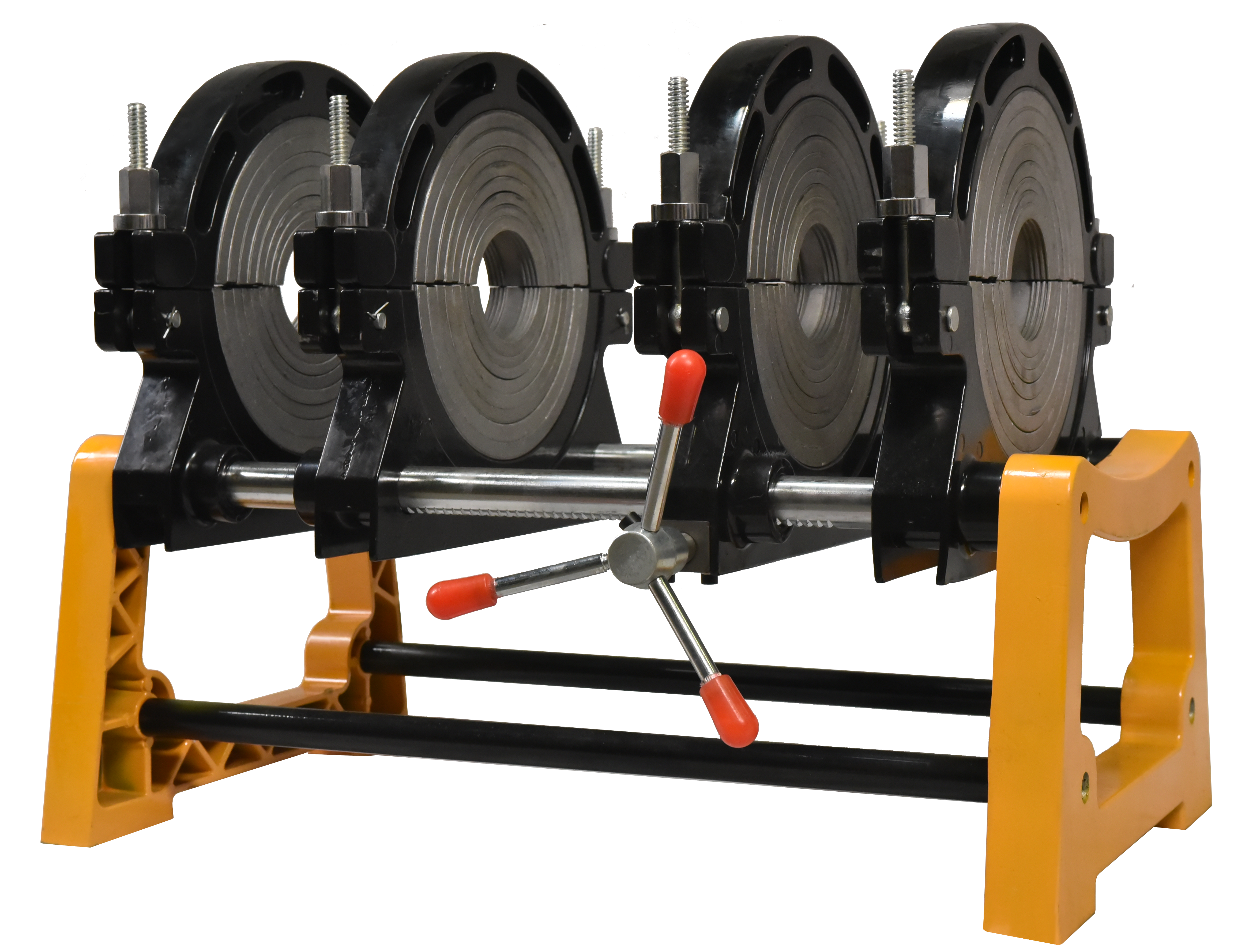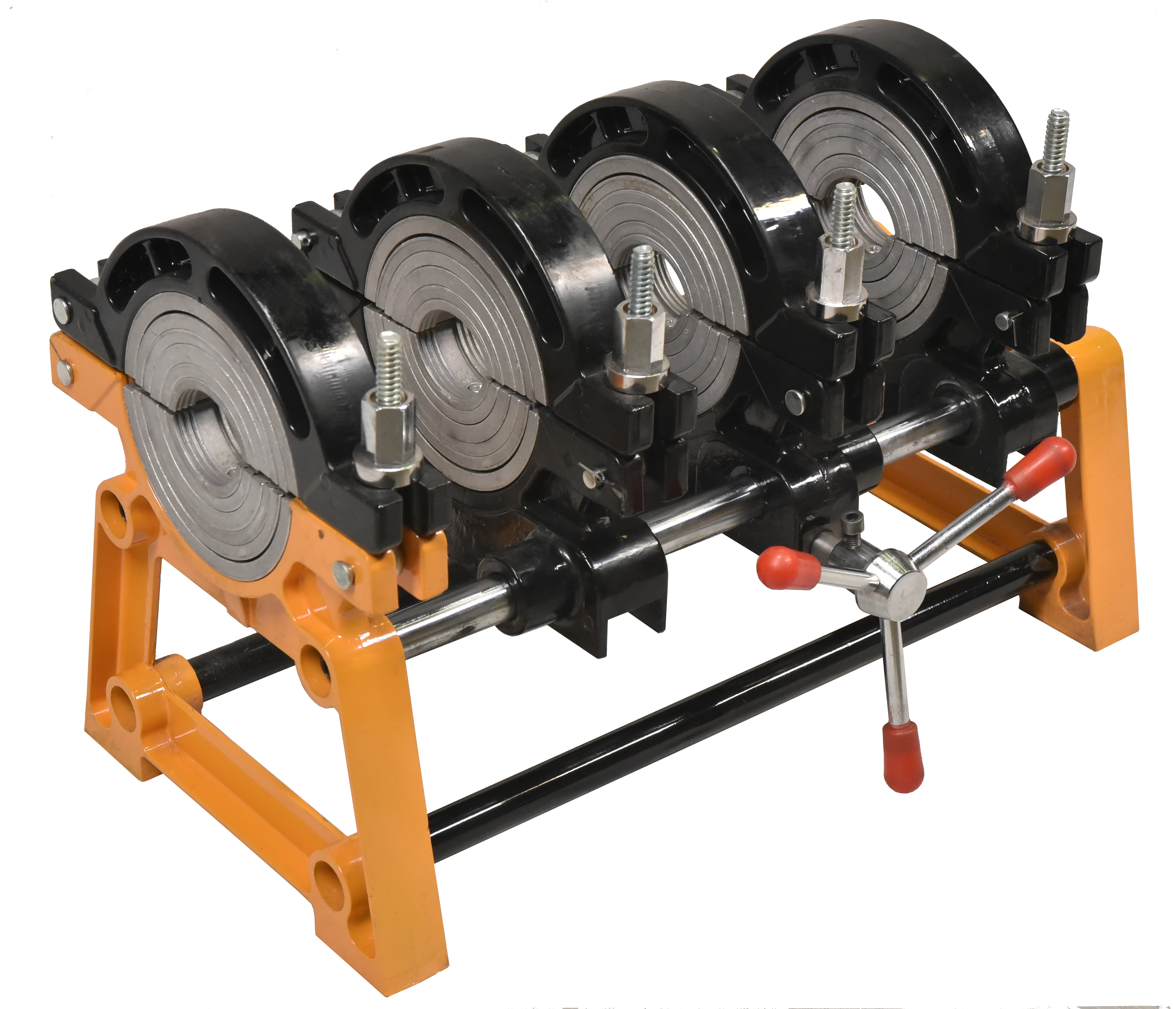 четыре алюминиевых зажима надёжно фиксируют трубы и обеспечивают точное совмещение кромок по оси, что особенно важно при работе в полевых условиях.