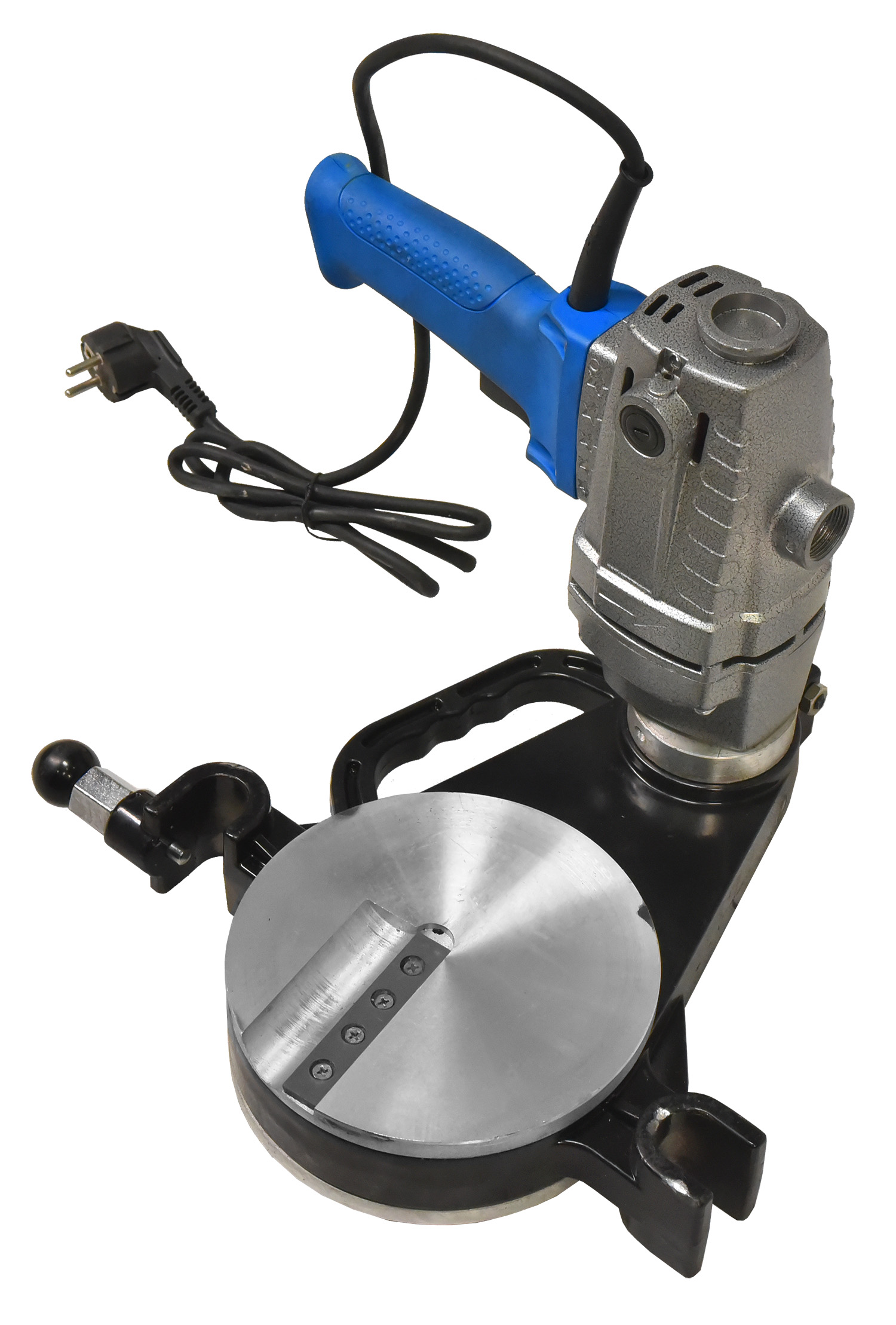 Машина оснащена центратором с двумя алюминиевыми зажимами, которые фиксируют трубы и обеспечивают точное совмещение кромок. Механический привод создаёт усилие для осадки стыка после прогрева, обеспечивая формирование равномерного сварного шва. Нагревательный элемент с тефлоновым покрытием прогревает торцы труб до заданной температуры, после чего выполняется стыковка под действием усилия.